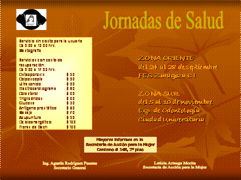 Durante la gestión pasada la secretaría a mi cargo se desarrollo Jornadas de Salud tanto en Ciudad Universitaria, como fuera del Campus de CU; lo que significa que se pueden realizar jornada de salud en otras cedes alternas para dar una mayor cobertura de atención sanitaria a las trabador@s del STUNAM, será en las próximas fecha cuando se conforme un proyecto que permita acercar los servicios médicos a otras facultades o unidades foráneas donde se requieren estos servicios de salud; la tarea de la Secretaria de Acción para la Mujer es la de realizar todas las negociaciones necesarias para hacer que estos servicios médicos presentados en las jornadas, lleguen a más trabajador@s al igual que a sus familiares.