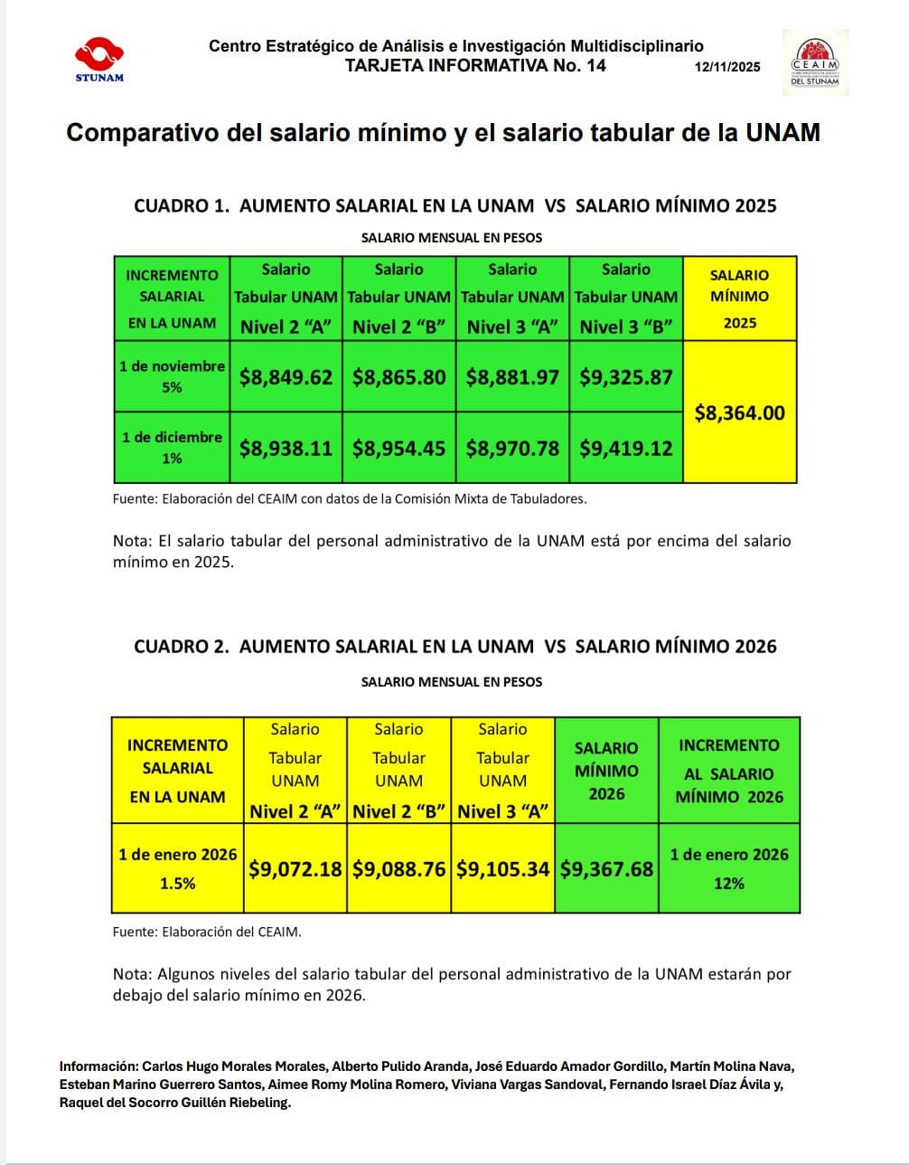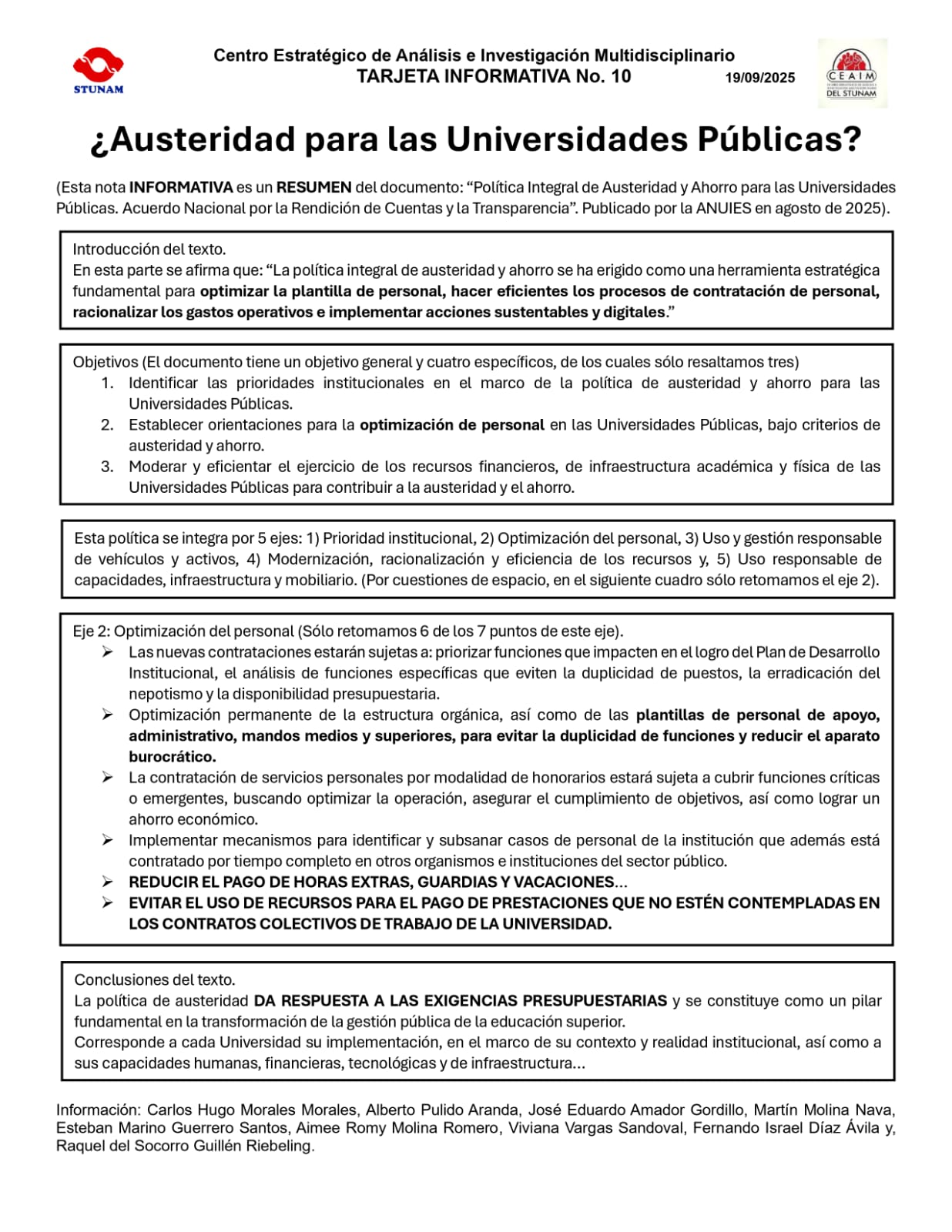 El CEAIM fue a creado y aprobado por el Consejo General de Representantes en 2017. Se dedica a realizar trabajo de investigación y análisis de los problemas nacionales presentando propuestas al STUNAM sobre los temas estructurales y de coyuntura, contando siempre con la dirección de la Secretaría de Prensa y Propaganda del STUNAM.