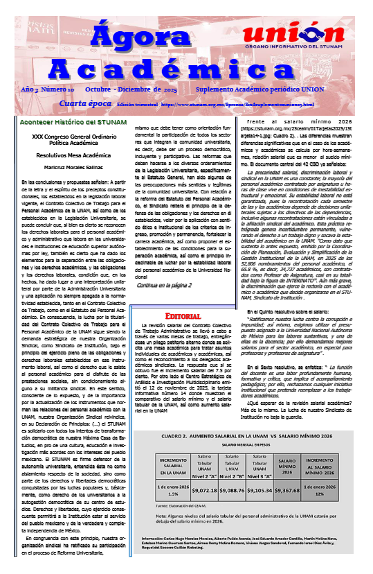 Suplemento Académico del semanario Unión, del Sindicato de Trabajadores de la Universidad Nacional Autónoma de México (STUNAM). Tiene una periodicidad trimestral y ofrece información del quehacer académico-sindidical de carácter nacional e intenacional, este material periodístico ofrece información de carácter histórico que pretende fortalecer la identidad sindical y reflexionar sobre la lucha de los trabajadores por mejorar su condiciones laborales.